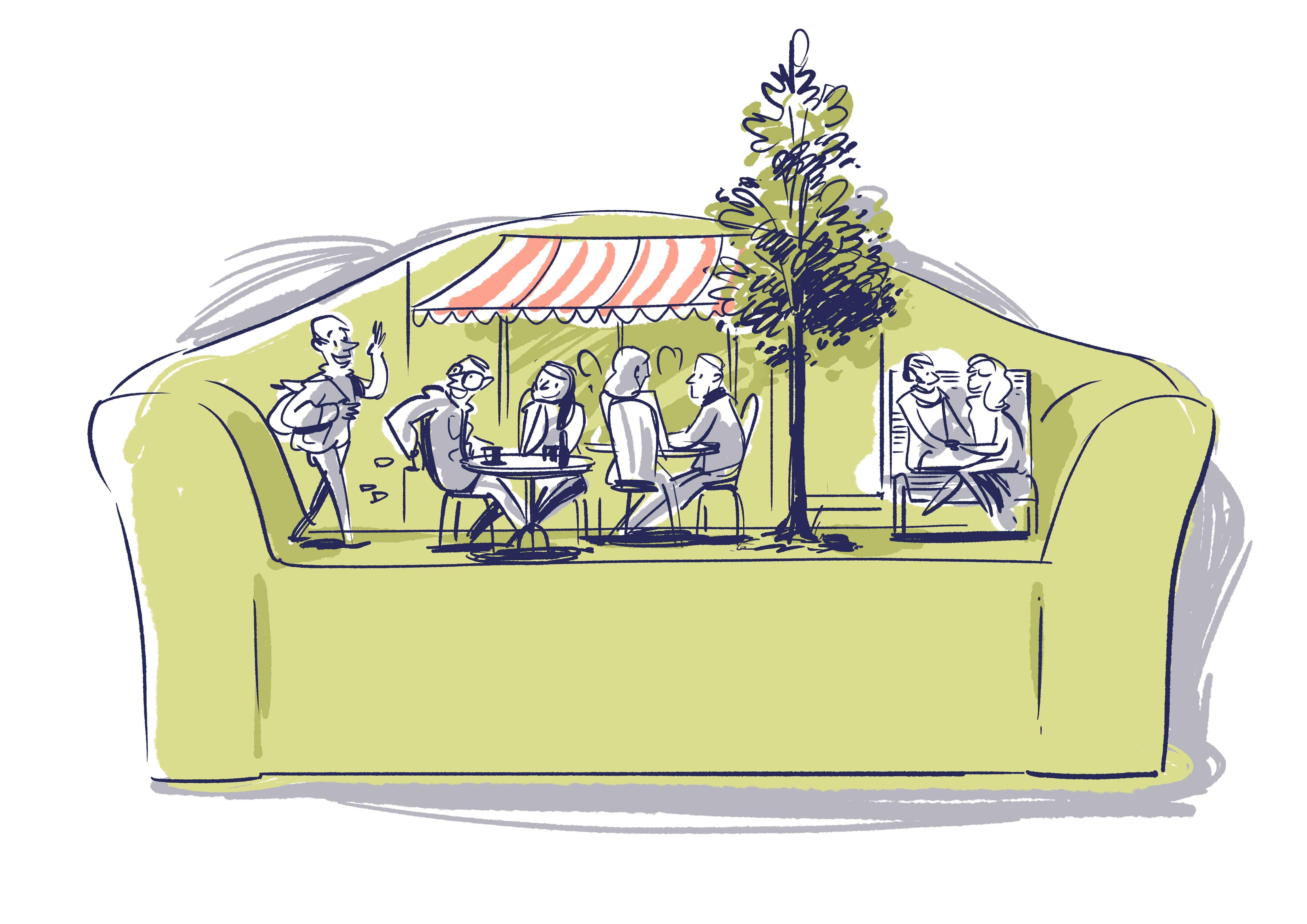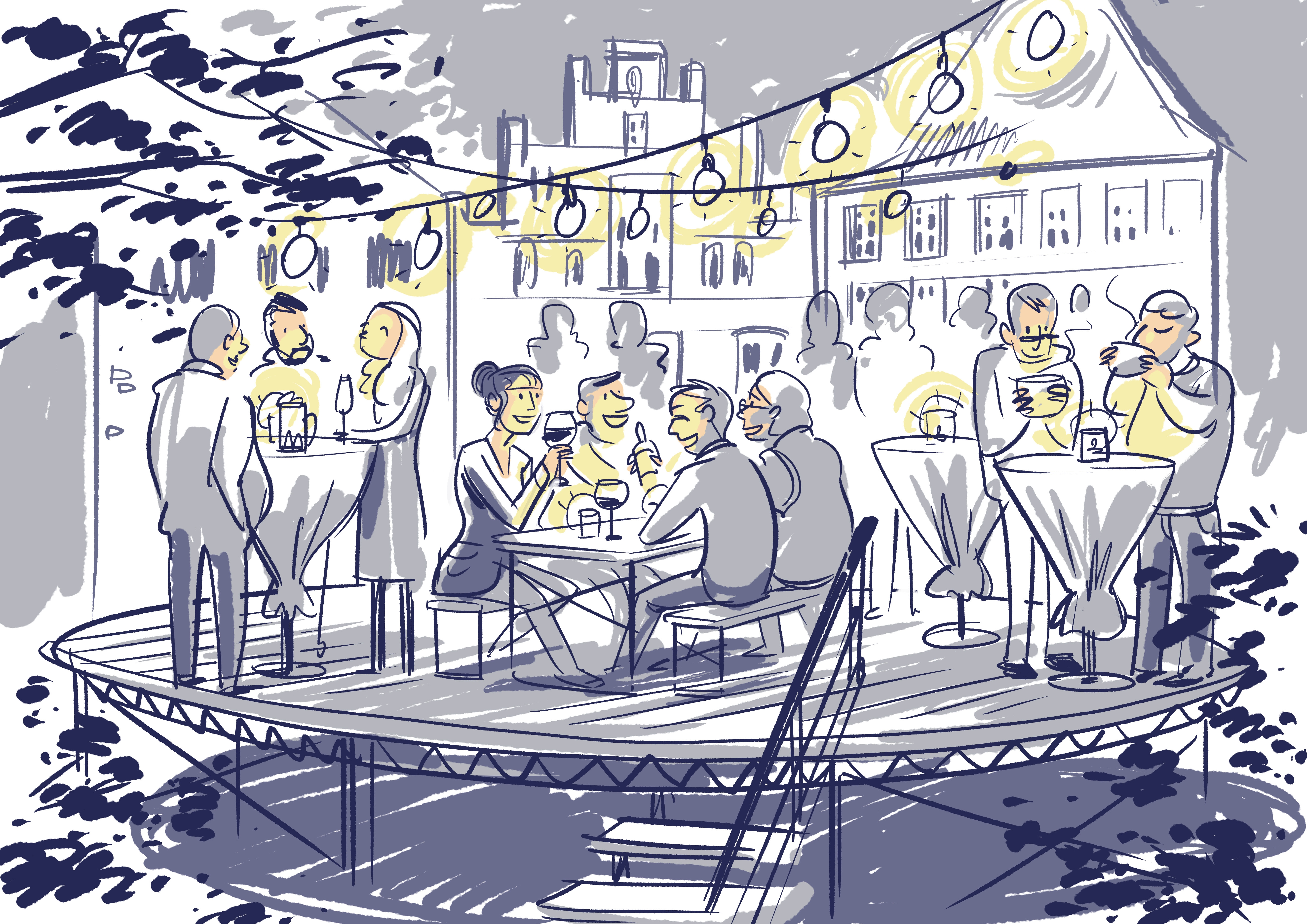 Die öffentliche Möblierung soll zukünftig durch neue und einheitliche Sitzelemente sowie Abfallbehälter ersetzt werden. Der aktuelle Bestand soll zurück gebaut und an anderer Stelle in der Stadt wieder eingesetzt werden. Auch an Spielgeräte, Ascher oder Ladestationen wird gedacht. Für die Außengastronomie ist eine Vielfalt gewünscht und es wird keine strikten Vorgaben geben. Weitere sichere, temporäre Abstellmöglichkeiten für Fahrräder werden insbesondere für die Nebenstraßen geprüft.