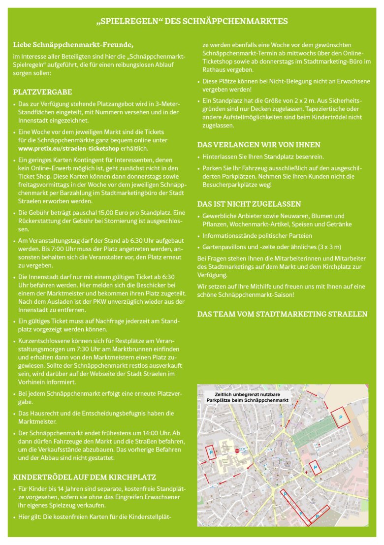 Die Karten für die Kinderstellplätze auf dem Kirchplatz werden ebenfalls über den Online-Ticketshop kostenfrei vergeben oder donnerstags, eine Woche vor dem gewünschten Schnäppchenmarkttermin, bei uns im Büro (Stadtmarketing, Stadt Straelen).