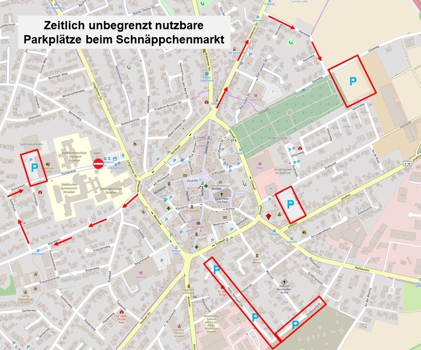 Die Stadt Straelen weist sowohl die Trödler als auch die Besucher der Schnäppchenmärkte darauf hin, alle Fahrzeuge ausschließlich auf öffentlichen Parkplätzen abzustellen. Zeitlich unbeschränkte Parkplätze sind beispielsweise folgende: