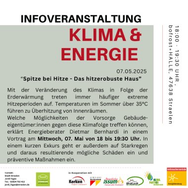 Eine Folge des Klimawandels sind immer häufiger auftretende Hitzeperioden in Straelen. Das stellt neue Anforderungen an Gebäude dar: Temperaturen im Sommer über 35°C führen zur Überhitzung von Innenräumen. In dem Vortrag am Mittwoch, 7. Mai von 18 bis 19:30 Uhr wird von Referent Dipl. Ing. Dietmar Bernhardi erläutert, welche Möglichkeiten der Vorsorge Sie als Gebäudeeigentümerin oder Gebäudeeigentümer treffen können. Das Referat erklärt auch die langfristigen Vorteile für die Hausbewohner, ihre Gesundheit und die Umwelt. Außerdem wird in einem Exkurs das Thema Starkregen, mögliche Schäden sowie präventive Maßnahmen behandelt und der Referent wird wie gewohnt ausführlich auf Fragen eingehen. Der Vortrag wird in Kooperation mit der Stadt Straelen als Südkreiskommune der Klima.Partner Kreis Kleve angeboten und ist Teil der Vortragsreihe Klima & Energie 3.0, die rund um die Themen Klimaschutz und Energieeffizienz Vorträge veranstaltet.