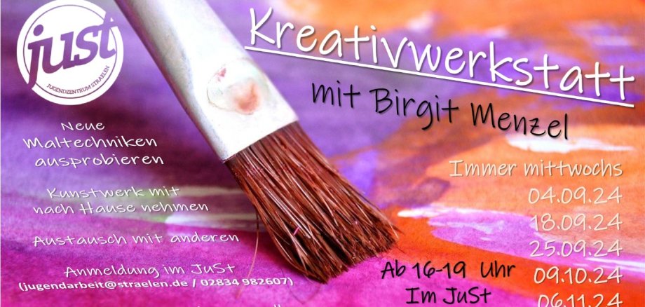 Ab dem 04. September können Kinder und Jugendliche ab Klasse 5 immer mittwochs im Straelener Jungenzentrum JuSt ihren kreativen und künstlerischen Fähigkeiten freien Lauf lassen. Das JuSt lädt ein zur Kreativwerkstatt mit Birgit Menzel. Alle, die Freude am Malen haben, neue Maltechniken ausprobieren möchten oder Lust auf den Austausch mit anderen haben, sind herzlich willkommen. Einfach über jugenarbeit@straelen.de oder telefonisch unter 02834 982607 anrufen, anmelden und dabei sein. Ein spontanes Mitmachen ist ebenfalls an allen Terminen möglich. Auch ist kein Problem, später hinzuzukommen oder früher zu gehen. Bis zu den Herbstferien findet die Kreativwerkstatt immer mittwochs in der Zeit von 16 Uhr bis 19 Uhr im JuSt satt. Nach den Herbstferien gibt es noch zwei Termine am 06. November und am 05. Dezember. Die Kunstwerke können selbstverständlich mit nach Hause genommen werden.