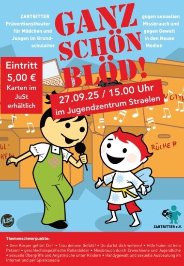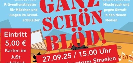 Am Samstag, den 27. September, ist das Präventionstheater von Zartbitter e.V. aus Köln erneut zu Gast im Jugendzentrum Straelen (JuSt). Um 15.00 Uhr wird das Theaterstück „Ganz schön blöd“ aufgeführt – ein kindgerechtes Bühnenstück mit Liedern zum Mitsingen. Im Mittelpunkt des Stücks stehen Themenschwerpunkte wie „Dein Körper gehört dir!“, „Trau deinem Gefühl!“ und „Hilfe holen ist kein Petzen!“. Ziel der Aufführung ist es, Kinder für ihre eigenen Gefühle und Grenzen zu sensibilisieren. Geeignet ist es für Grundschulkinder und 5. Klassen.