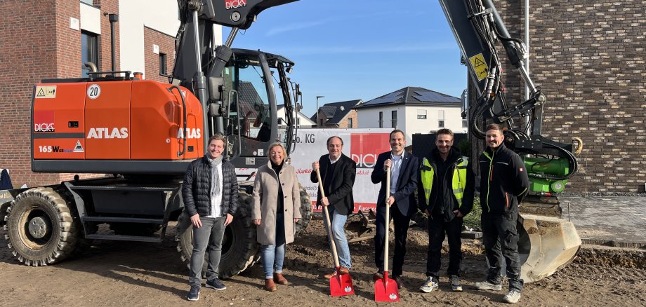 Mit dem offiziellen Spatenstich hat nun der Endausbau des ersten Bauabschnitts des „Gemüseplatzes“ in Straelen begonnen. Nicht einmal drei Jahre nach Freigabe der Baustraße trafen sich hierzu (im Bild v.l.n.r.) Jon Stewering (Ingenieurbüro Stewering), Josefine Beenken (Voba Wohnbau), Christian Maas und Bürgermeister Bernd Kuse (Straelener Projektentwicklungsgesellschaft) sowie Daniel Dicks und Kevin Ripkens (Fa. Dicks). In drei Bauabschnitten werden bis zum Frühjahr 2025 die Verlängerung der Hans-Tenhaeff-Straße, die Straße "Gemüseplatz" sowie die Grünanlagen und Lärmschutzwände des gesamten Baugebiets durch die bauausführende Firma Dicks GmbH & Co. KG fertiggestellt. Die Straelener Projektentwicklungsgesellschaft und die beteiligten Unternehmen bitten die Anwohnerinnen und Anwohner um Verständnis für entstehende Unannehmlichkeiten während der Bauphase.